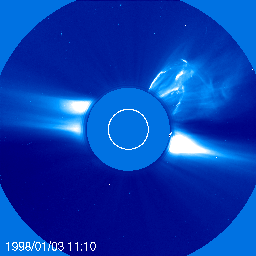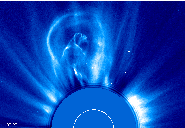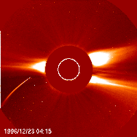 Halo CMEs were given their name because of their appearance which resembles a diffuse 'halo' around the Sun. The halo can encircle the entire corona or only a part of it. Halo CMEs were discovered with the NRL SOLWIND experiment (Howard et al., 1982, ApJ, 263, L101). The halo signature is that of a CME that originates on the solar disk and is directed toward LASCO which is near the Earth. Many halo CMEs do impact the Earth and cause geomagnetic storms (Brueckner et al., 1998, GRL, 25, 3019; Webb et al., 2000, JGR, 105, 7491; Cane et al., 2000, GRL, 27, 3591).