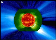 (MPEG 2.8 MB) On the disk, the photospheric magnetic field measurements from the Wilcox Solar Observatory are shown. In the lower corona, the images are the intensity of the Fe XIV line measuremed in C1 and, in the outer corona, the Thomson scattered white-light detected by C2. Observed between 1996 August 13 and September 8. |